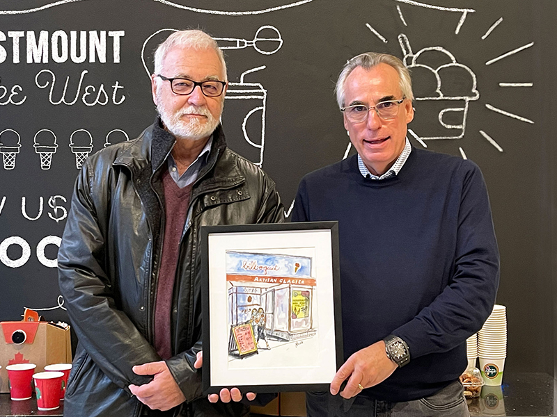 La rencontre s’est terminée sur une note touchante où monsieur Bailey a remis au propriétaire une œuvre qu’il a lui-même créée, symbolisant un moment croqué sur le vif au Bilboquet l’été dernier. Le tableau a immédiatement été accrochée au mur de l’Artisan Glacier.
