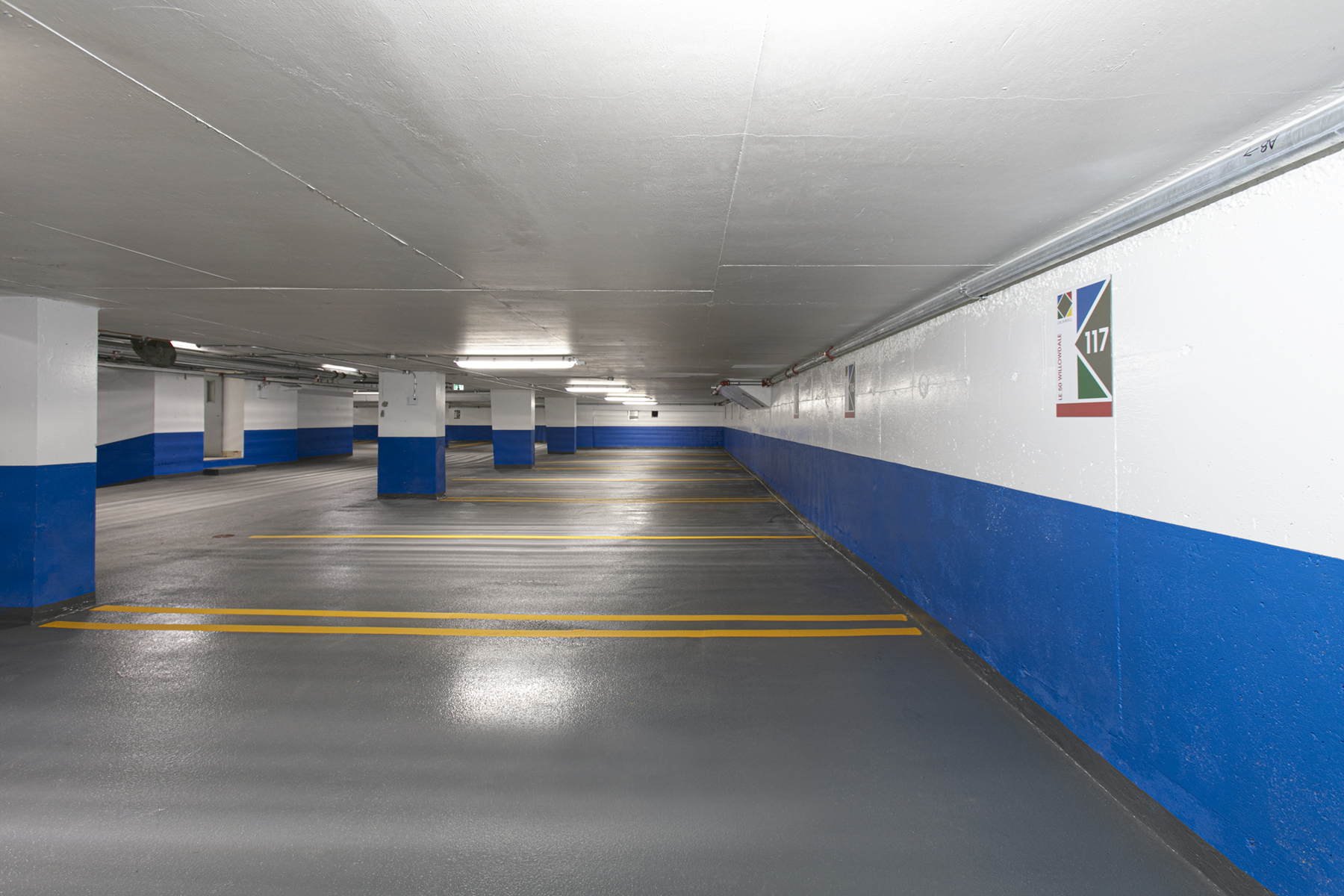 The floor surface and membrane had to be removed and replaced. The drains and the water pipes as well as the mechanical room have been restored. New signage signs have been placed in each parking space to identify by number. Energy efficient lighting system has been installed.