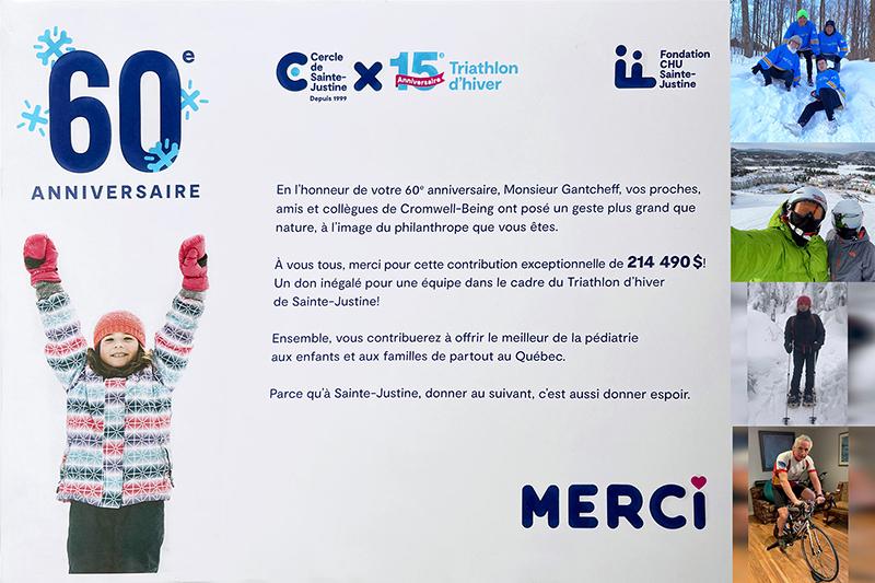 In order to mark the 60th birthday of this philanthropist and with respect to the sanitary measures put in place, family members, friends and colleagues from work united their time to participate in the Virtual Winter Triathlon for the Ste-Justine Foundation.