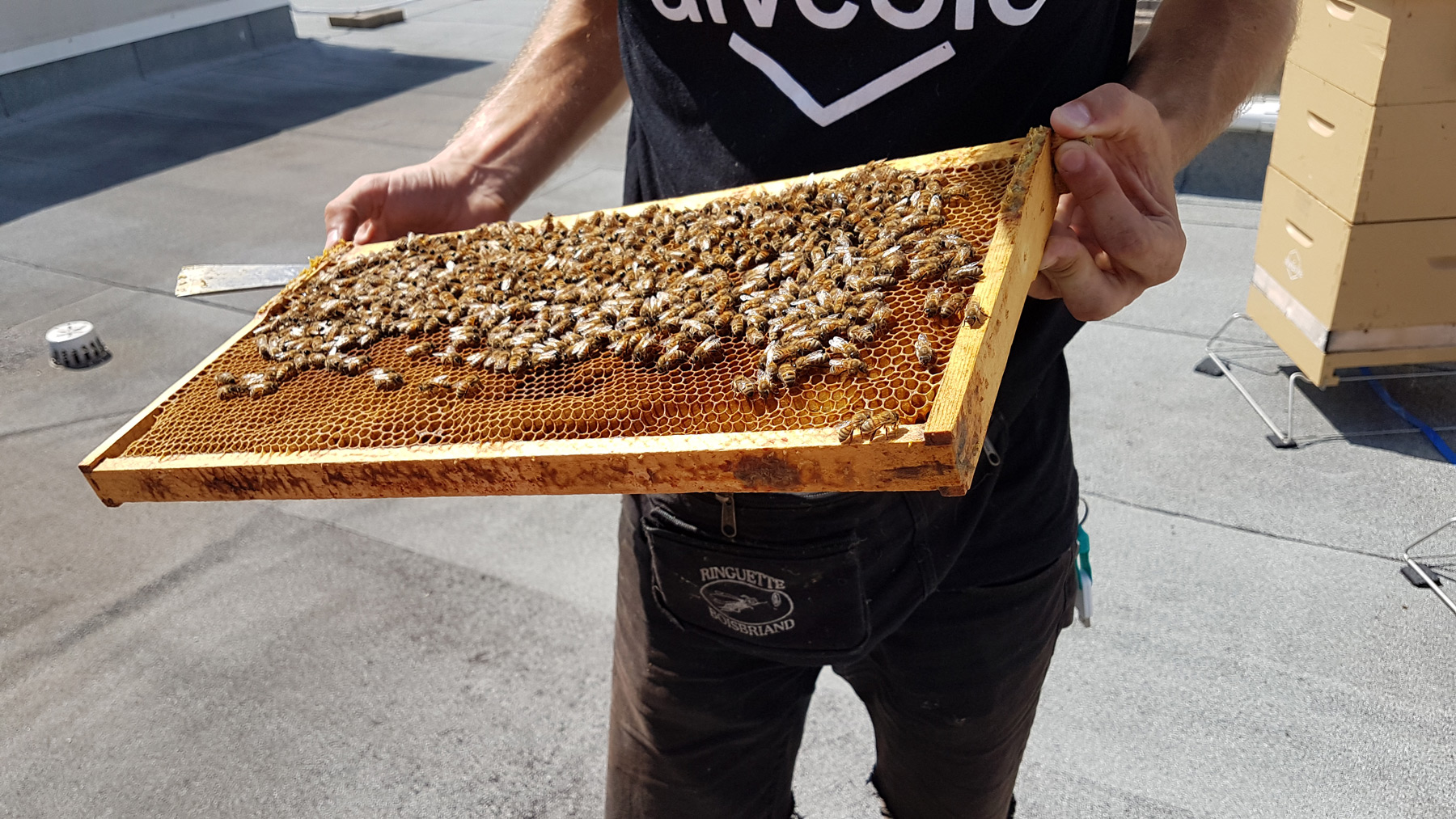 Préparation de la récolte de miel 2018 sur le toit du Ramezay (Montréal).